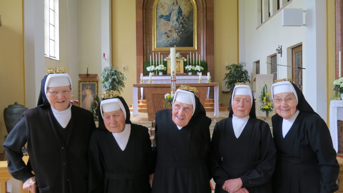 Zum Abschluss der Osterexerzitien am 28. April 2019 feierten fünf Schwestern das diamantene Professjubiläum – S. M Luitgard Süß, S. M. Manfreda Kraft, S. M. Alexandra Birner, S. M. Petra Wahl und S. M. Reinhilde Neubauer (von l. n. r.): 60 Jahre im Dienst des Herrn – für die ganze Mutterhausgemeinschaft ein freudiger Anlass, Gott zu danken und Seine Treue zu preisen! Ursprünglich waren die Schwestern zu sechst. S. M. Beata Wittmann ist schon verstorben. Ihr Foto stand am Seitenaltar, wo auch die sechs Professkerzen brannten.