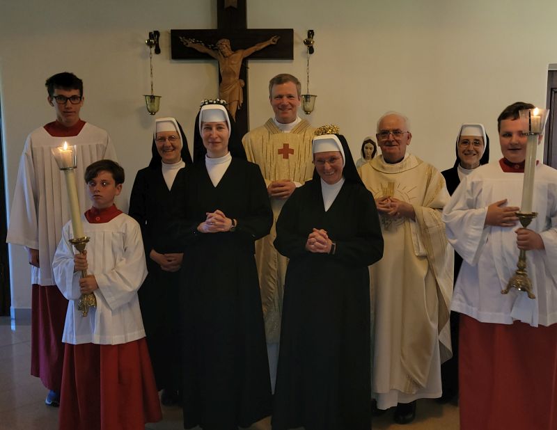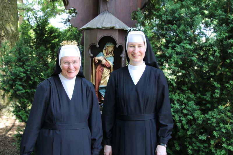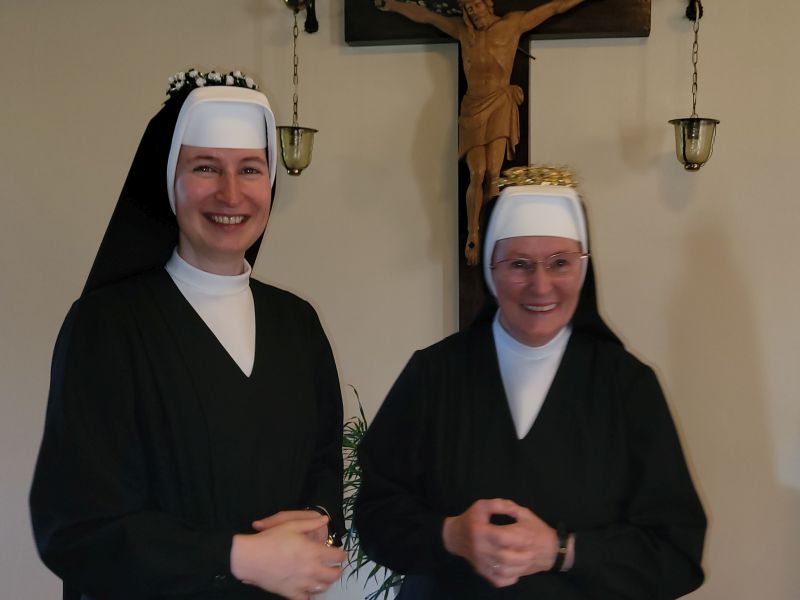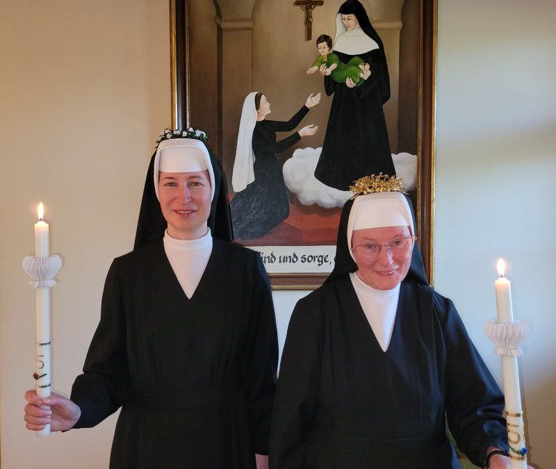Zum Abschluss der Exerzitien am 12. Juni 2022 feierten zwei Schwestern ihr Ordensjubiläum: S. M. Christa hatte vor 50 Jahren Profess abgelegt und trug ein goldenes Kränzchen. S. M. Theresia blickt auf 25 Jahre Profess zurück. Beiden leuchtete das Glück aus den strahlenden Gesichtern. Bei der Festmesse erneuerten sie vor der hl. Kommunion ihr Versprechen. Nach dem feierlichen Auszug und der Gratulation im Foyer gab es einen Festakt im Saal mit Chorgesang, Gedichten und einem Sketch. Wahrhaft ein Tag der Freude und Dankbarkeit für die ganze Ordensgemeinchaft!