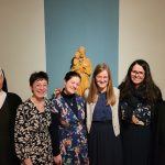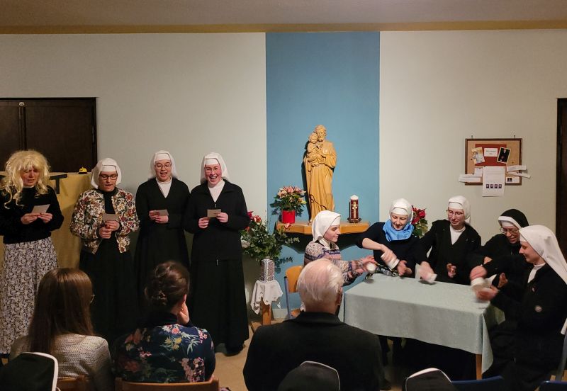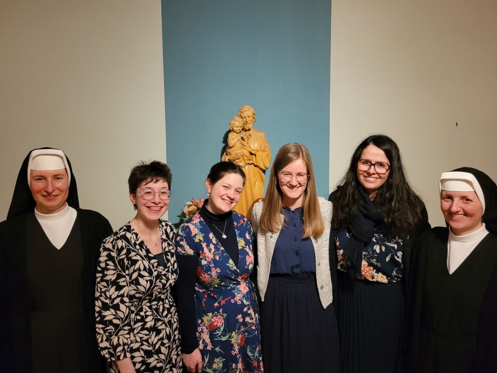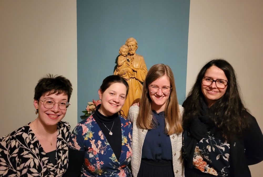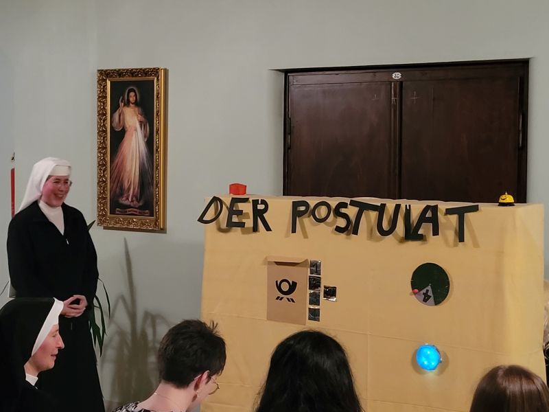 Am Samstag, 18. Febr. 2023, wurden vier Kandidatinnen – Natalie, Anne, Mirjam, Margareta (von links nach rechts) – in das Postulat aufgenommen und bereiten sich nun ein halbes Jahr lang auf die Einkleidung am Samstag, 26. Aug. 2023, vor, unter Anleitung von S. M. Klarissa. Traditionell ging der Zeremonie die Andacht über unser Ordenszeichen voraus, die vom Chor gestaltet wurde. Die besinnlichen Texte stimmten wunderbar ein auf diesen nächsten wichtigen Schritt in das Ordensleben. Sr. Provinzoberin Theresia nahm die Bitte der vier um Aufnahme in das Postulat entgegen und steckte ihnen dann das zuvor gesegnete Ordenszeichen an. Hausgeistlicher Pfr. Werner gab jeder Postulantin mit der Reliquie unserer Ordensgründer den Einzelsegen. Im Foyer stand schon ein geheimnisvoller von den Novizinnen gebastelter Automat, „der Postulat“, bereit, der einige Details über die vier Postulantinnen und ihre mutmaßlichen Gründe (Scherz!) für ihren Klostereintritt preisgab. Mit einem „Bechersong“ wünschten die aktuellen Novizinnen den zukünftigen Novizinnen Gottes Schutz und Beistand.