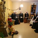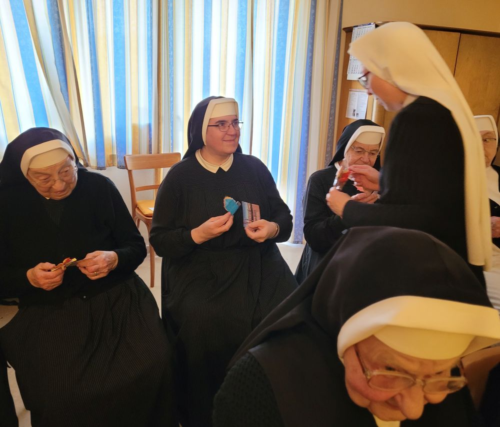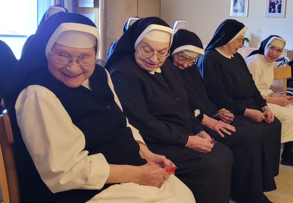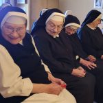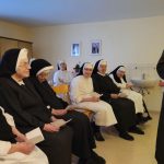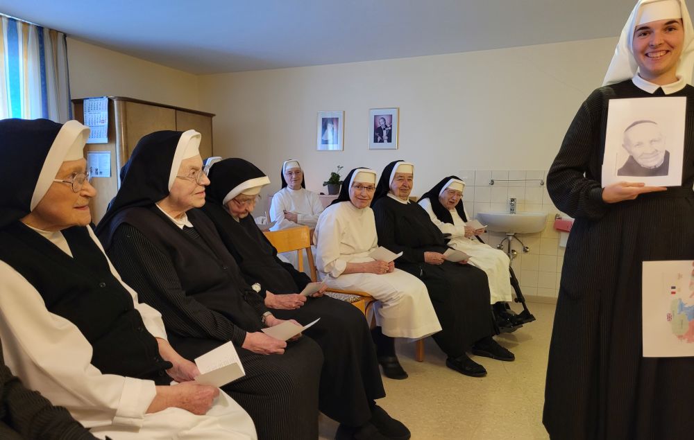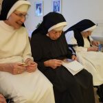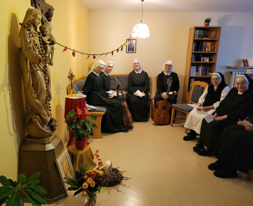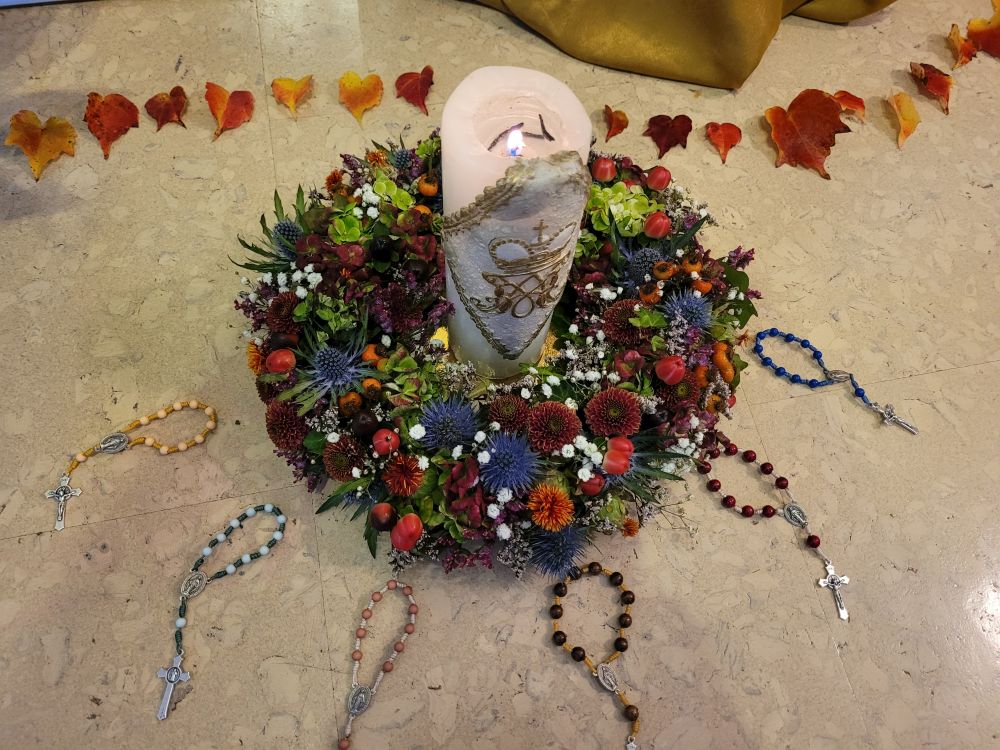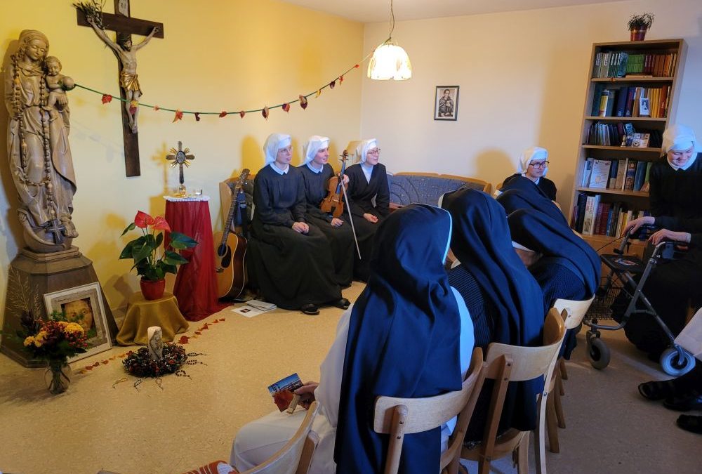 Wenn die Schwestern des Ruheheims ins Noviziat eingeladen werden, gleicht der Weg dorthin einer halben Weltreise; denn das Noviziat liegt am anderen Ende es Mutterhauskomplexes. Nichtsdestotrotz haben sich alle Bewohnerinnen des Ruheheims am 26. Okt. 2024 nachmittags eingefunden, um zusammen mit den Novizinnen den Rosenkranzmonat Oktober zu begehen. Anlass war der österreichische Staatsfeiertag genau an diesem Tag; denn genau vor 69 Jahren wurde Österreich wider Erwarten frei von den sowjetischen Besatzern. Geholfen hat der Aufruf zum Rosenkranzgebet durch P. Petrus Pavlicek, dem sich auch die damaligen Politiker anschlossen. Mit Liedern und einem Rosenkranzgesätzchen gedachten wir dieses geschichtsmächtigen Gebetes. Das Noviziat war geschmückt mit bunten Herbstblättern, einem Blumensteckring und kleinen Rosenkränzchen. Als Andenken bekamen unsere Gäste eine Karte, verziert mit einem Herbstblatt und einem Schokoriegel, mit. Auf der Karte stand ein Ausspruch des hl. P. Pio: „Der Rosenkranz ist die Waffe für diese Zeit.“
