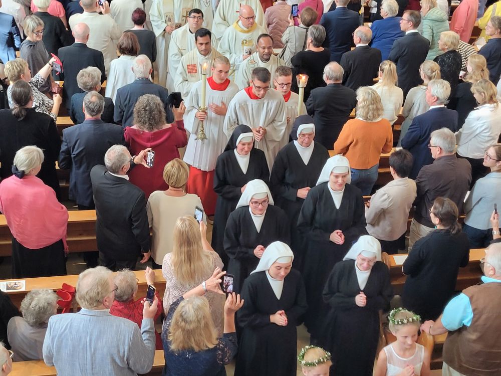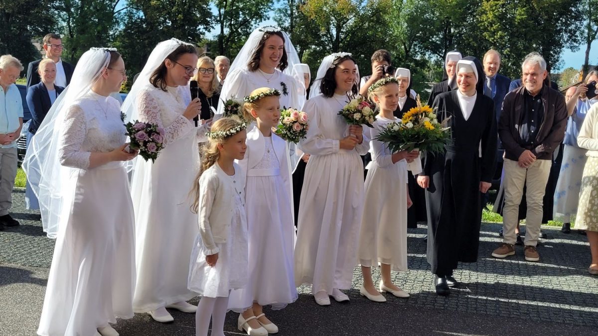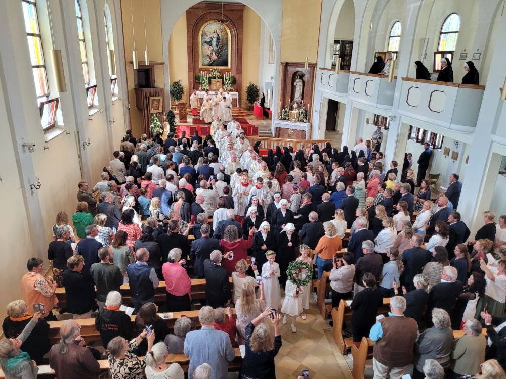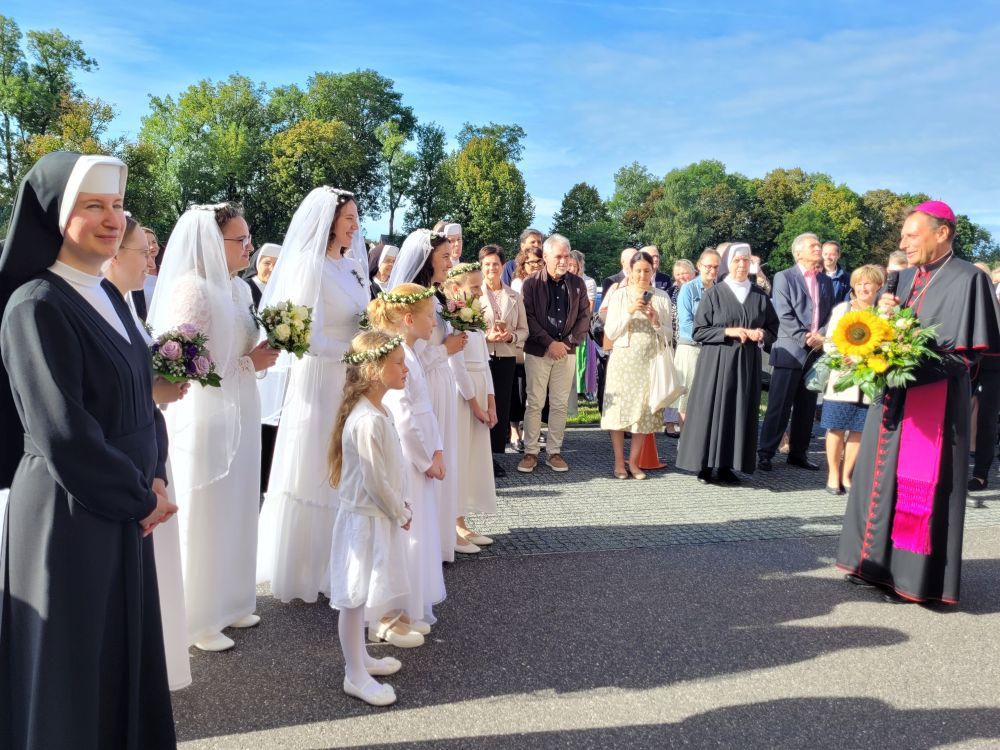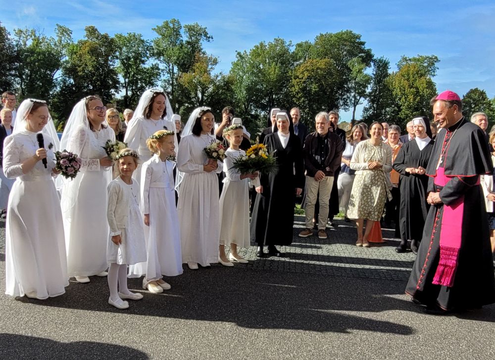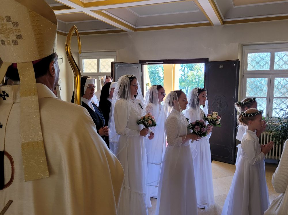 Am 3. Sept. 2025 erhielten vier Postulantinnen in der Mutterhauskirche aus den Händen von Herrn Erzbischof Herwig Gössl von Bamberg das Ordenskleid und das Stundenbuch (kirchliches Gebetbuch). Viele Angehörige, Freunde und Bekannte waren gekommen, um diesen wichtigen Schritt ins Ordensleben zu begleiten. Die Begrüßung des Erzbischofs fand – wie gewohnt – mit einem gemeinsam gesungenen Kanon aller Anwesenden und mit kleinen Versen der Festtagskinder vor dem Portal des Mutterhauses statt. Während der Liturgie verkündete der Erzbischof die neuen Namen: Schwester Maria Vincenta (Rebekka), S. M. Madita (Lisa), S. M. Cordis (Maria), S. Marie-Therese (Birte). Seine Predigt begann er mit der Feststellung: „Mit Ihrem Entschluss des Klostereintritts haben Sie in die Gesichter Ihrer Bekannten Fragezeichen gezaubert.“ Viele hielten eine solche Lebensweise für „schräg“. Der Prediger lobte die Konsequenz der vier, deren strahlende Gesichter für sich sprächen. Wo ein Brautpaar auftaucht, zieht die Braut alle Blicke auf sich und man ist „entzückt“, auch wenn man mit ihr gar nicht bekannt ist. Eine Familie zu gründen, ist nachvollziehbar. „Aber das heute ist nicht normal. Indem Sie das Ordenskleid anlegen, bekennen Sie, dass Jesus Christus Ihr Bräutigam ist, dem Sie Ihr Leben anvertrauen. Wie Paulus könnten Sie sagen, dass Sie den göttlichen Glanz auf dem Antlitz Christi entdeckt haben. Sie stellen sich heute als zerbrechliche Gefäße zur Verfügung, um den größten Schatz aufzunehmen. Sie legen Zeugnis ab vom lebendigen Herrn Jesus Christus, der allein einen Menschen glücklich machen kann. Sie zeigen, dass es mehr gibt, als was man kaufen und sich erarbeiten kann. Das Entscheidende kann man sich nur von Gott schenken lassen.“ So weit die Predigt des Bamberger Oberhirten. Nach der Liturgie, feierlich gestaltet vom Schwesternchor und Instrumentalensemble, traf sich die Festgemeinde in der Turnhalle der Realschule zum Mittagsmahl. In einem lustigen Sketch der „alten“ Novizinnen für die vier neuen ging es um ein geheimnisvolles Paket, dem sie eine Ukulele entnahmen, auf der sie ihr Begrüßungslied begleiteten. Aus der Slowakei war die Generaloberin Mutter Metoda mit ihrer Assistentin S. M. Xavera, die sehr gut Deutsch spricht, angereist.