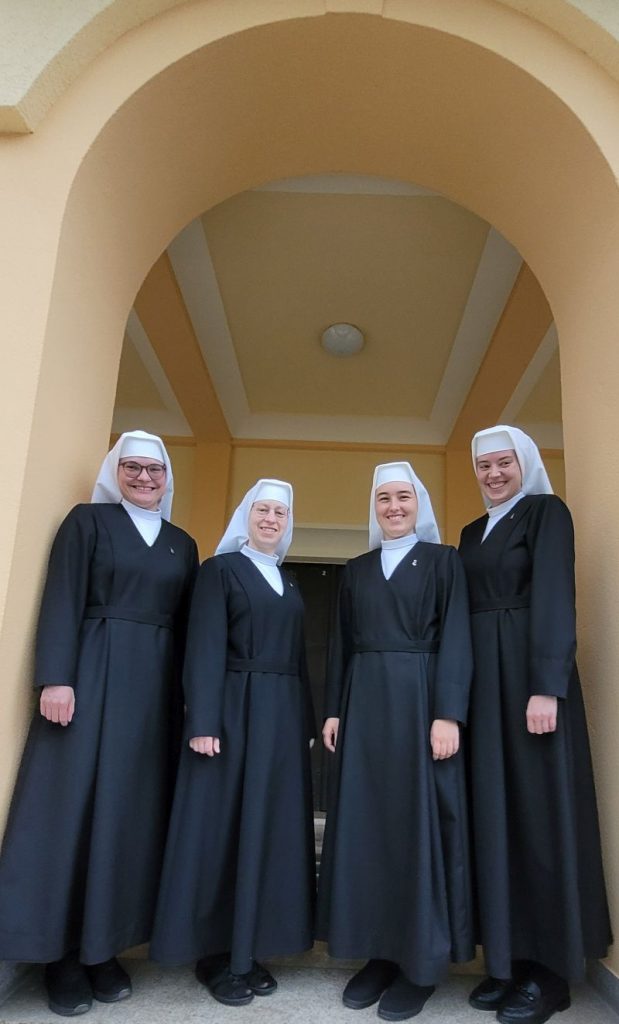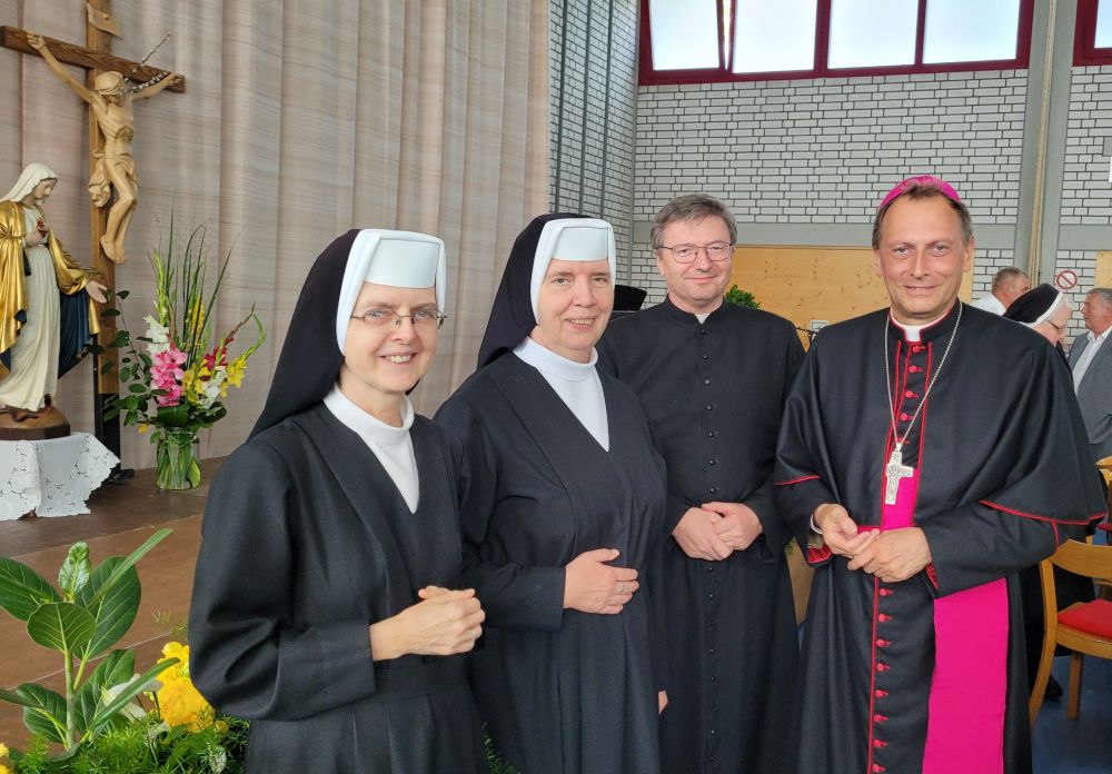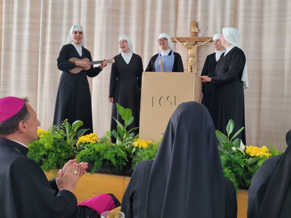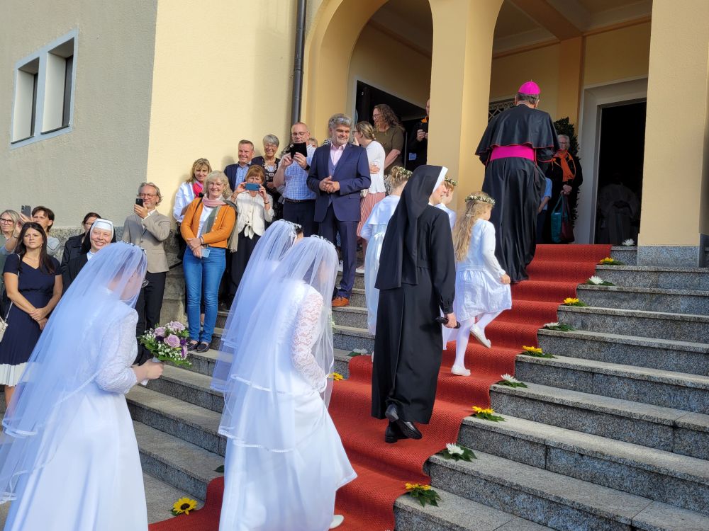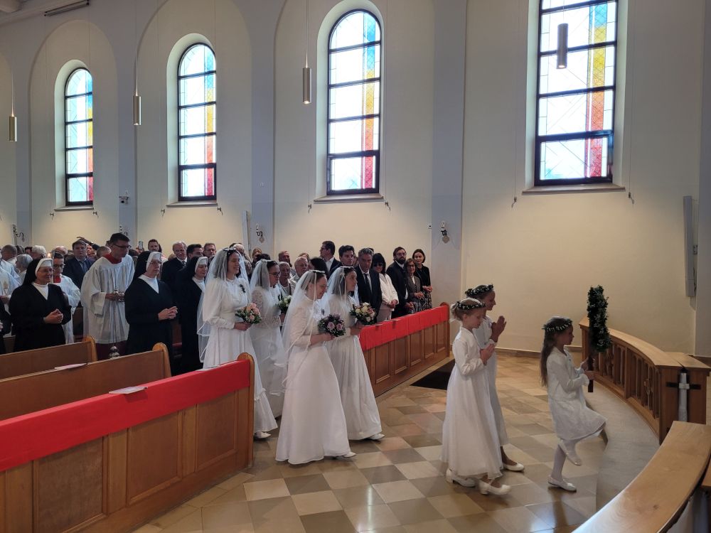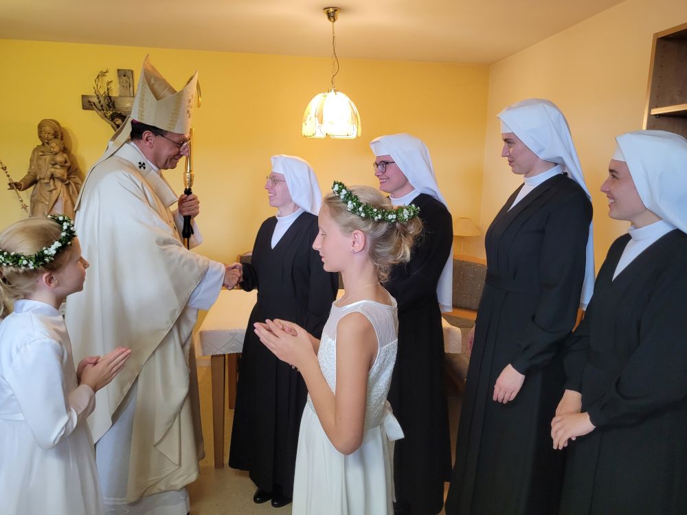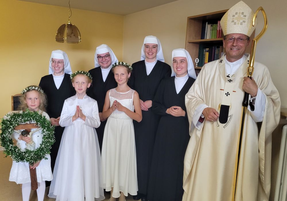 Am 3. Sept. 2025 erhielten vier Postulantinnen in der Mutterhauskirche aus den Händen von Herrn Erzbischof Herwig Gössl von Bamberg das Ordenskleid und das Stundenbuch (kirchliches Gebetbuch). Viele Angehörige, Freunde und Bekannte waren gekommen, um diesen wichtigen Schritt ins Ordensleben zu begleiten. Die Begrüßung des Erzbischofs fand – wie gewohnt – mit einem gemeinsam gesungenen Kanon aller Anwesenden und mit kleinen Versen der Festtagskinder vor dem Portal des Mutterhauses statt. Während der Liturgie verkündete der Erzbischof die neuen Namen: Schwester Maria Vincenta (Rebekka), S. M. Madita (Lisa), S. M. Cordis (Maria), S. Marie-Therese (Birte). Seine Predigt begann er mit der Feststellung: „Mit Ihrem Entschluss des Klostereintritts haben Sie in die Gesichter Ihrer Bekannten Fragezeichen gezaubert.“ Viele hielten eine solche Lebensweise für „schräg“. Der Prediger lobte die Konsequenz der vier, deren strahlende Gesichter für sich sprächen. Wo ein Brautpaar auftaucht, zieht die Braut alle Blicke auf sich und man ist „entzückt“, auch wenn man mit ihr gar nicht bekannt ist. Eine Familie zu gründen, ist nachvollziehbar. „Aber das heute ist nicht normal. Indem Sie das Ordenskleid anlegen, bekennen Sie, dass Jesus Christus Ihr Bräutigam ist, dem Sie Ihr Leben anvertrauen. Wie Paulus könnten Sie sagen, dass Sie den göttlichen Glanz auf dem Antlitz Christi entdeckt haben. Sie stellen sich heute als zerbrechliche Gefäße zur Verfügung, um den größten Schatz aufzunehmen. Sie legen Zeugnis ab vom lebendigen Herrn Jesus Christus, der allein einen Menschen glücklich machen kann. Sie zeigen, dass es mehr gibt, als was man kaufen und sich erarbeiten kann. Das Entscheidende kann man sich nur von Gott schenken lassen.“ So weit die Predigt des Bamberger Oberhirten. Nach der Liturgie, feierlich gestaltet vom Schwesternchor und Instrumentalensemble, traf sich die Festgemeinde in der Turnhalle der Realschule zum Mittagsmahl. In einem lustigen Sketch der „alten“ Novizinnen für die vier neuen ging es um ein geheimnisvolles Paket, dem sie eine Ukulele entnahmen, auf der sie ihr Begrüßungslied begleiteten. Aus der Slowakei war die Generaloberin Mutter Metoda mit ihrer Assistentin S. M. Xavera, die sehr gut Deutsch spricht, angereist.