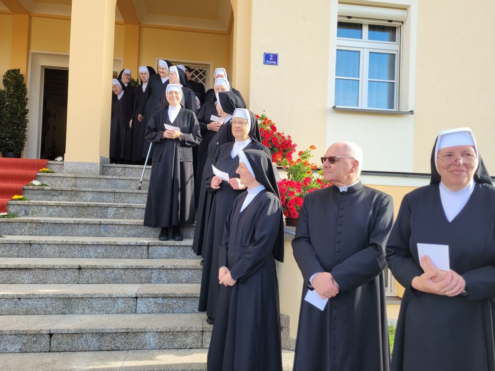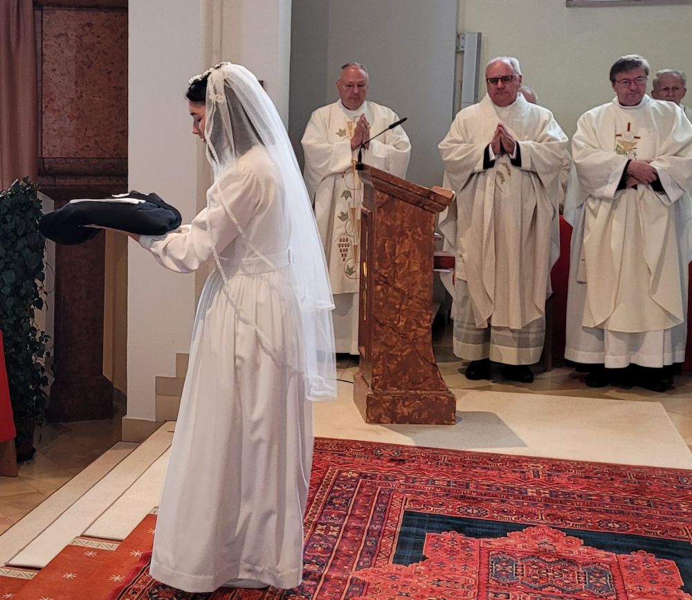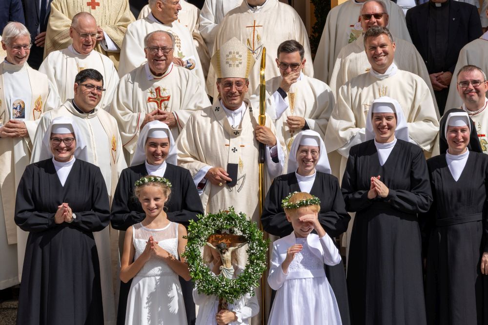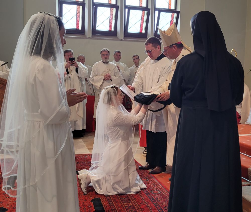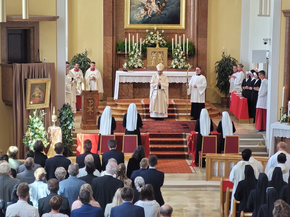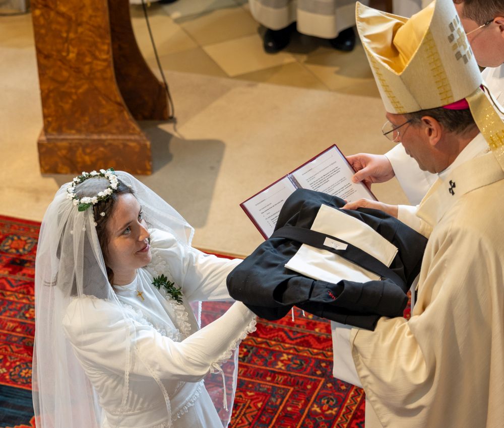 Am 3. Sept. 2025 erhielten vier Postulantinnen in der Mutterhauskirche aus den Händen von Herrn Erzbischof Herwig Gössl von Bamberg das Ordenskleid und das Stundenbuch (kirchliches Gebetbuch). Viele Angehörige, Freunde und Bekannte waren gekommen, um diesen wichtigen Schritt ins Ordensleben zu begleiten. Die Begrüßung des Erzbischofs fand – wie gewohnt – mit einem gemeinsam gesungenen Kanon aller Anwesenden und mit kleinen Versen der Festtagskinder vor dem Portal des Mutterhauses statt. Während der Liturgie verkündete der Erzbischof die neuen Namen: Schwester Maria Vincenta (Rebekka), S. M. Madita (Lisa), S. M. Cordis (Maria), S. Marie-Therese (Birte). Seine Predigt begann er mit der Feststellung: „Mit Ihrem Entschluss des Klostereintritts haben Sie in die Gesichter Ihrer Bekannten Fragezeichen gezaubert.“ Viele hielten eine solche Lebensweise für „schräg“. Der Prediger lobte die Konsequenz der vier, deren strahlende Gesichter für sich sprächen. Wo ein Brautpaar auftaucht, zieht die Braut alle Blicke auf sich und man ist „entzückt“, auch wenn man mit ihr gar nicht bekannt ist. Eine Familie zu gründen, ist nachvollziehbar. „Aber das heute ist nicht normal. Indem Sie das Ordenskleid anlegen, bekennen Sie, dass Jesus Christus Ihr Bräutigam ist, dem Sie Ihr Leben anvertrauen. Wie Paulus könnten Sie sagen, dass Sie den göttlichen Glanz auf dem Antlitz Christi entdeckt haben. Sie stellen sich heute als zerbrechliche Gefäße zur Verfügung, um den größten Schatz aufzunehmen. Sie legen Zeugnis ab vom lebendigen Herrn Jesus Christus, der allein einen Menschen glücklich machen kann. Sie zeigen, dass es mehr gibt, als was man kaufen und sich erarbeiten kann. Das Entscheidende kann man sich nur von Gott schenken lassen.“ So weit die Predigt des Bamberger Oberhirten. Nach der Liturgie, feierlich gestaltet vom Schwesternchor und Instrumentalensemble, traf sich die Festgemeinde in der Turnhalle der Realschule zum Mittagsmahl. In einem lustigen Sketch der „alten“ Novizinnen für die vier neuen ging es um ein geheimnisvolles Paket, dem sie eine Ukulele entnahmen, auf der sie ihr Begrüßungslied begleiteten. Aus der Slowakei war die Generaloberin Mutter Metoda mit ihrer Assistentin S. M. Xavera, die sehr gut Deutsch spricht, angereist.