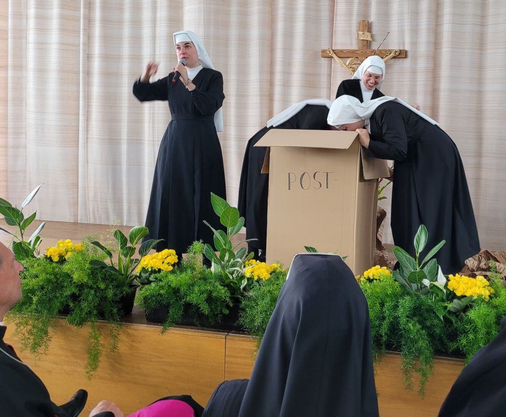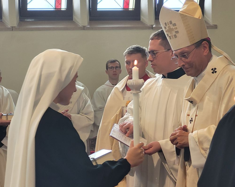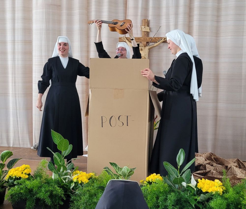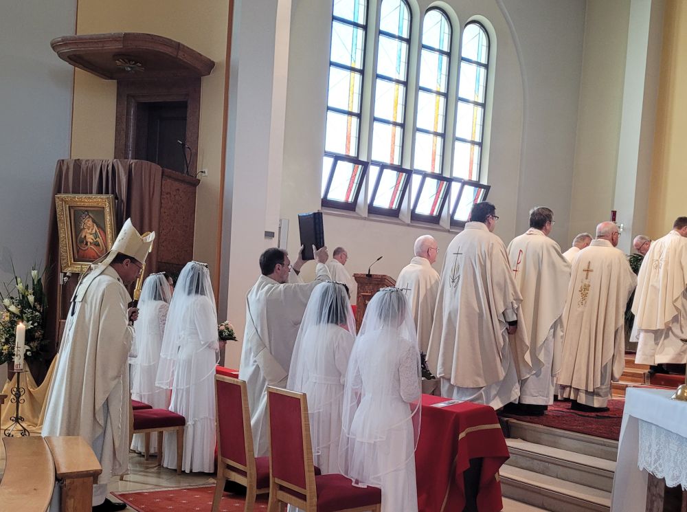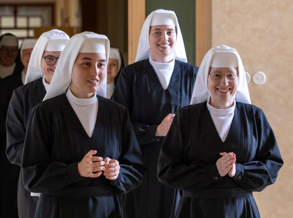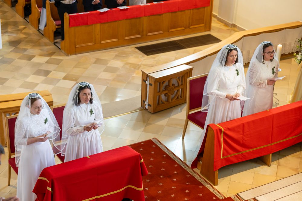 Am 3. Sept. 2025 erhielten vier Postulantinnen in der Mutterhauskirche aus den Händen von Herrn Erzbischof Herwig Gössl von Bamberg das Ordenskleid und das Stundenbuch (kirchliches Gebetbuch). Viele Angehörige, Freunde und Bekannte waren gekommen, um diesen wichtigen Schritt ins Ordensleben zu begleiten. Die Begrüßung des Erzbischofs fand – wie gewohnt – mit einem gemeinsam gesungenen Kanon aller Anwesenden und mit kleinen Versen der Festtagskinder vor dem Portal des Mutterhauses statt. Während der Liturgie verkündete der Erzbischof die neuen Namen: Schwester Maria Vincenta (Rebekka), S. M. Madita (Lisa), S. M. Cordis (Maria), S. Marie-Therese (Birte). Seine Predigt begann er mit der Feststellung: „Mit Ihrem Entschluss des Klostereintritts haben Sie in die Gesichter Ihrer Bekannten Fragezeichen gezaubert.“ Viele hielten eine solche Lebensweise für „schräg“. Der Prediger lobte die Konsequenz der vier, deren strahlende Gesichter für sich sprächen. Wo ein Brautpaar auftaucht, zieht die Braut alle Blicke auf sich und man ist „entzückt“, auch wenn man mit ihr gar nicht bekannt ist. Eine Familie zu gründen, ist nachvollziehbar. „Aber das heute ist nicht normal. Indem Sie das Ordenskleid anlegen, bekennen Sie, dass Jesus Christus Ihr Bräutigam ist, dem Sie Ihr Leben anvertrauen. Wie Paulus könnten Sie sagen, dass Sie den göttlichen Glanz auf dem Antlitz Christi entdeckt haben. Sie stellen sich heute als zerbrechliche Gefäße zur Verfügung, um den größten Schatz aufzunehmen. Sie legen Zeugnis ab vom lebendigen Herrn Jesus Christus, der allein einen Menschen glücklich machen kann. Sie zeigen, dass es mehr gibt, als was man kaufen und sich erarbeiten kann. Das Entscheidende kann man sich nur von Gott schenken lassen.“ So weit die Predigt des Bamberger Oberhirten. Nach der Liturgie, feierlich gestaltet vom Schwesternchor und Instrumentalensemble, traf sich die Festgemeinde in der Turnhalle der Realschule zum Mittagsmahl. In einem lustigen Sketch der „alten“ Novizinnen für die vier neuen ging es um ein geheimnisvolles Paket, dem sie eine Ukulele entnahmen, auf der sie ihr Begrüßungslied begleiteten. Aus der Slowakei war die Generaloberin Mutter Metoda mit ihrer Assistentin S. M. Xavera, die sehr gut Deutsch spricht, angereist.