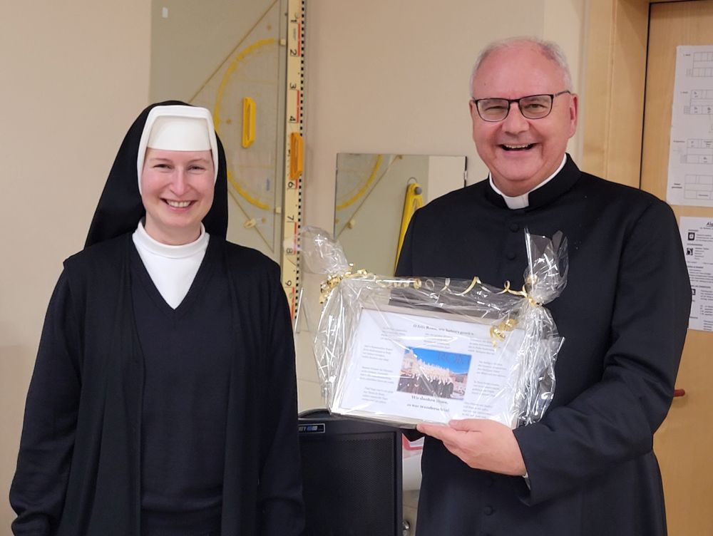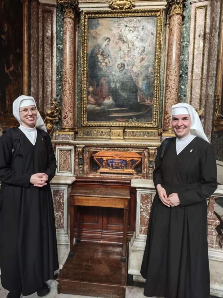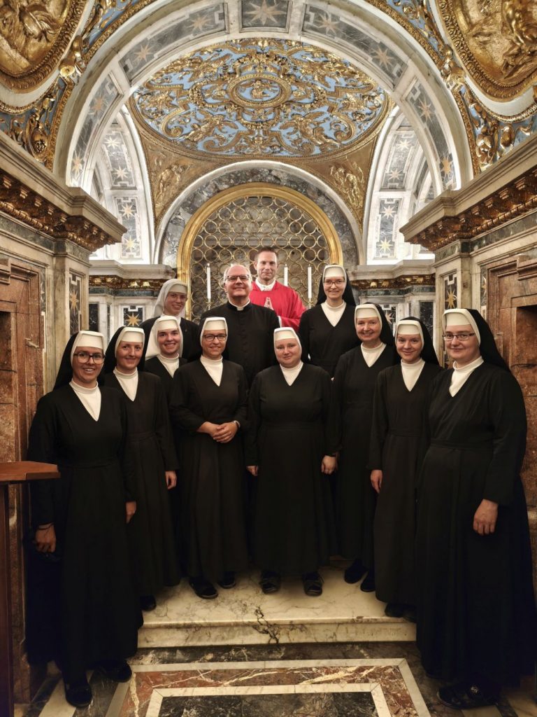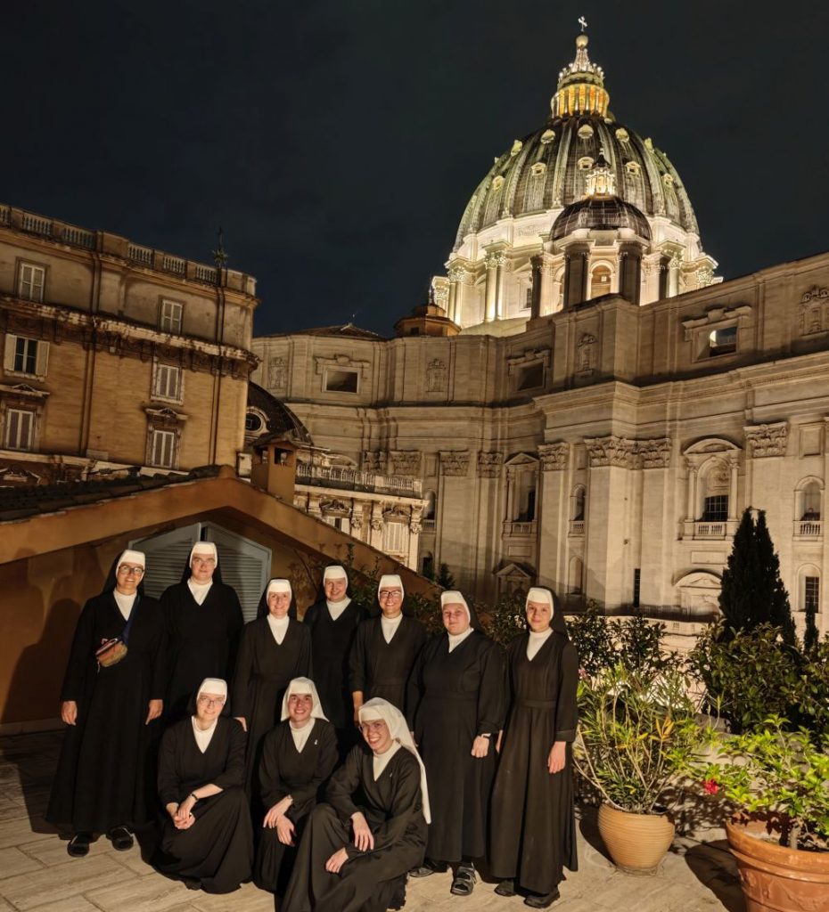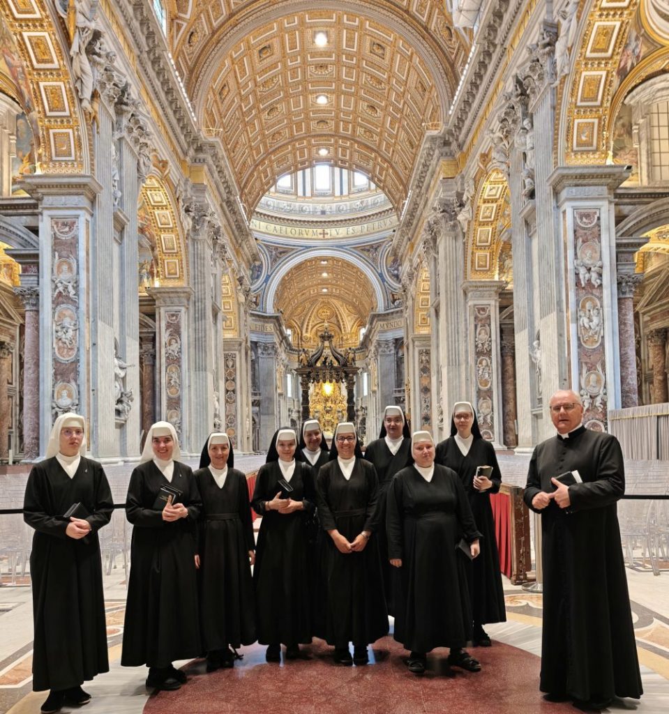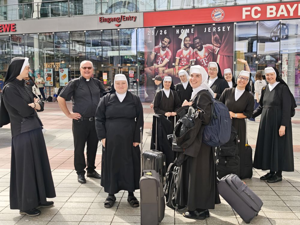 Dank Pfarrer Kilian Kemmer von Höchstadt, einem erfahrenen Rompilgerführer, hatten zehn Schwestern von uns Gelegenheit, vom 7. bis 12. September 2025 eine Heilig-Jahr-Wallfahrt nach Rom zu unternehmen. Der Flug verlief reibungslos. Quartier bezogen sie in der Nähe vom Campo Santo Teutonico im Vatikan. Einen ersten Abendspaziergang machten sie von der Engelsbrücke zum Petersdom. Sie trafen andere bayerische Pilger und stellten sich mit der Bayernfahne dem Fotografen. Am 2. Tag war das antike Rom an der Reihe mit dem Kapitol, dem Kolosseum, der Basilika San Clemente und der Lateranbasilika, wo sie die Heilige Pforte durchschritten. Der dritte Tag begann mit einer hl. Messe direkt am Grab des hl. Petrus. Die Teilnehmer beteten auch an den anderen Papstgräbern, z. B. bei Papst Benedikt XVI. Während der Führung im Petersdom war die Pieta von Michelangelo ein besonderes Erlebnis. Eine große Statue an einer Säule im Hauptschiff stellt unseren Ordensgründer, den hl. Pierre Fourier, dar. Die Kirche des hl. Philipp Neri und stand ebenfalls auf dem Programm der Pilger. Die Novizinnen freuten sich besonders über den Besuch der letzten Ruhestätte des hl. Stanislaus Kostka, des Patrons der Novizen, in Sant Andrea al Quirinale. Unvergesslich bleibt den Pilgern die hl. Messe in der Katakombe des hl. Callistus. Beeindruckend waren auch St. Paul vor den Mauern, Begräbnisort des hl. Paulus, und die Basilika Tre Fontane, der Ort des Martyriums des hl. Paulus. Erfüllt von vielen Eindrücken und geistlichen Anregungen kehrten unsere Schwestern zurück. Wir „Hinterbliebenen“ konnten uns mitfreuen und einen Eindruck bekommen am 24. Sept. 2025 beim Nachtreffen im Mutterhaus mit Pfr. Kemmer, wo eine Bilderpräsentation gezeigt und noch einmal das Gstanzl der Schwestern gesungen wurde.