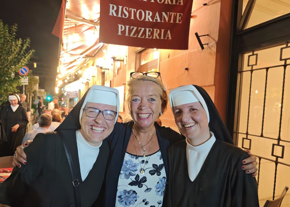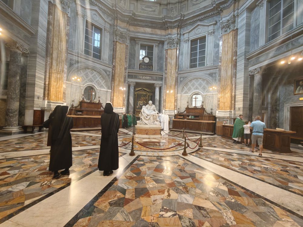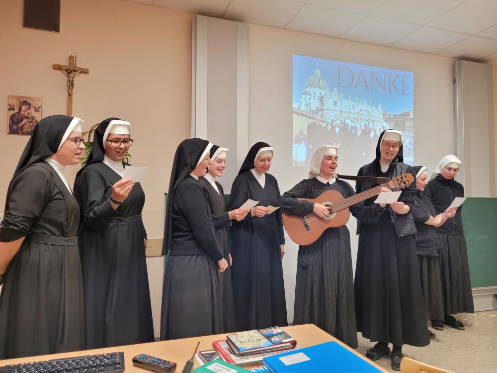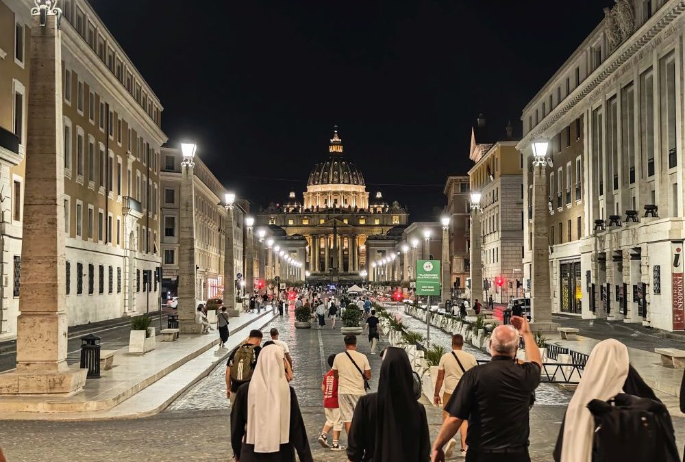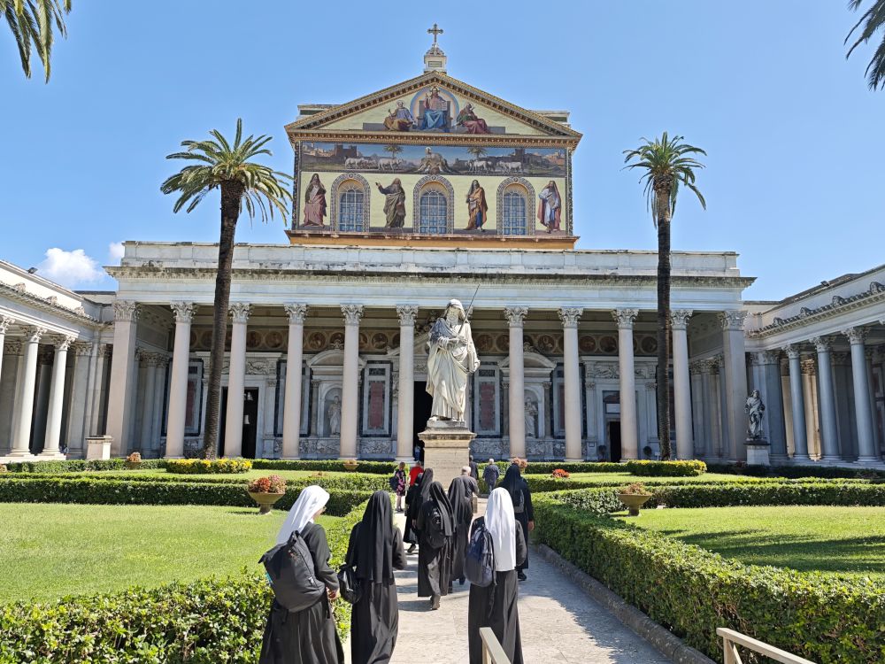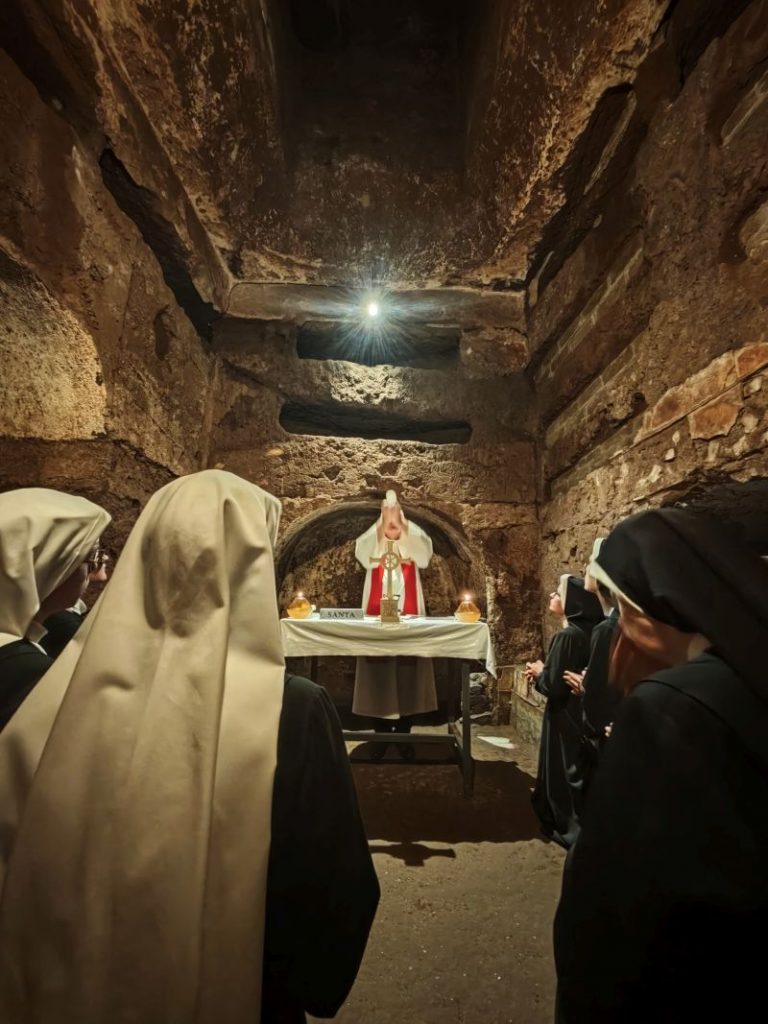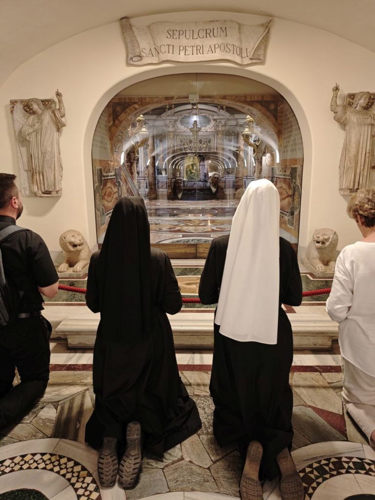 Dank Pfarrer Kilian Kemmer von Höchstadt, einem erfahrenen Rompilgerführer, hatten zehn Schwestern von uns Gelegenheit, vom 7. bis 12. September 2025 eine Heilig-Jahr-Wallfahrt nach Rom zu unternehmen. Der Flug verlief reibungslos. Quartier bezogen sie in der Nähe vom Campo Santo Teutonico im Vatikan. Einen ersten Abendspaziergang machten sie von der Engelsbrücke zum Petersdom. Sie trafen andere bayerische Pilger und stellten sich mit der Bayernfahne dem Fotografen. Am 2. Tag war das antike Rom an der Reihe mit dem Kapitol, dem Kolosseum, der Basilika San Clemente und der Lateranbasilika, wo sie die Heilige Pforte durchschritten. Der dritte Tag begann mit einer hl. Messe direkt am Grab des hl. Petrus. Die Teilnehmer beteten auch an den anderen Papstgräbern, z. B. bei Papst Benedikt XVI. Während der Führung im Petersdom war die Pieta von Michelangelo ein besonderes Erlebnis. Eine große Statue an einer Säule im Hauptschiff stellt unseren Ordensgründer, den hl. Pierre Fourier, dar. Die Kirche des hl. Philipp Neri und stand ebenfalls auf dem Programm der Pilger. Die Novizinnen freuten sich besonders über den Besuch der letzten Ruhestätte des hl. Stanislaus Kostka, des Patrons der Novizen, in Sant Andrea al Quirinale. Unvergesslich bleibt den Pilgern die hl. Messe in der Katakombe des hl. Callistus. Beeindruckend waren auch St. Paul vor den Mauern, Begräbnisort des hl. Paulus, und die Basilika Tre Fontane, der Ort des Martyriums des hl. Paulus. Erfüllt von vielen Eindrücken und geistlichen Anregungen kehrten unsere Schwestern zurück. Wir „Hinterbliebenen“ konnten uns mitfreuen und einen Eindruck bekommen am 24. Sept. 2025 beim Nachtreffen im Mutterhaus mit Pfr. Kemmer, wo eine Bilderpräsentation gezeigt und noch einmal das Gstanzl der Schwestern gesungen wurde.