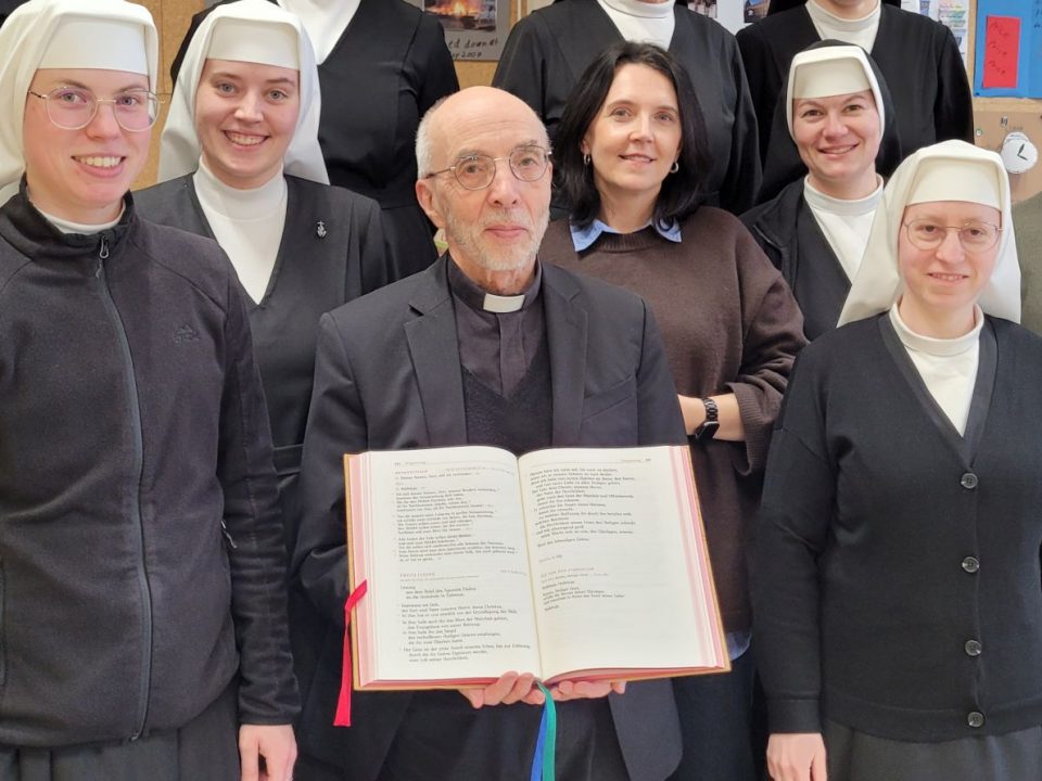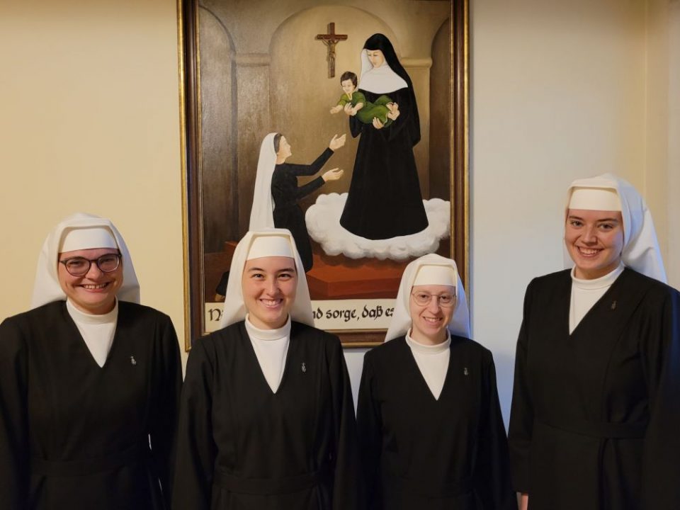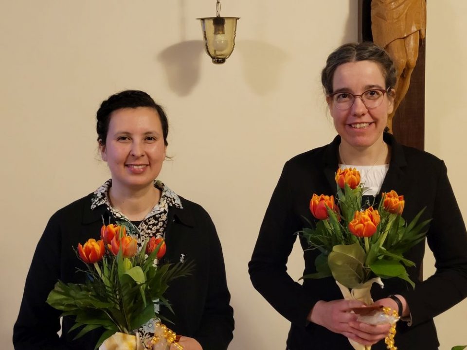Am Samstag, 28. Febr. 2026, wurden Nicole (Erzbistum Berlin) und Iris (Erzbistum Köln) in das Postulat aufgenommen und begannen die sechsmonatige Vorbereitung auf die Einkleidung am 29. Aug. 2026. Bei einer feierlichen Andacht in der Mutterhauskirche betrachteten wir unser Ordenszeichen, das die Spiritualität unseres Ordens veranschaulicht, und beteten um Treue zu unserer Berufung und für die zwei Neuen.