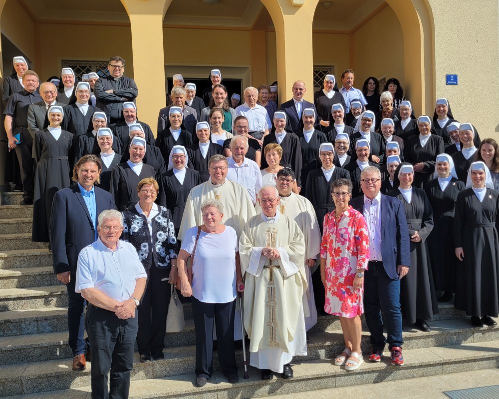 Vor genau 50 Jahren, am 7. Sept. 1974, empfing unser Hausgeistlicher Pfr. Albert Werner die Priesterweihe in seiner Heimat Duderstadt im Eichsfeld. Von dort waren etliche Angehörige angereist, um am 7. Sept. 2024 - wiederum ein Samstag - dem Jubilar zu gratulieren. In der mit Blumen geschmückten Mutterhauskirche feierte er den Festgottesdienst, wobei einige Ministranten am Altar dienten und der Schwesternchor erklang. Anschließend wurde Pfr. Werner in den Saal zum Mittagessen geleitet. Vor dem Kaffee gab es einige Darbietungen zu Ehren des Jubilars. Auch Filmausschnitte der damaligen Priesterweihe und Primiz in Duderstadt und Fotos von Pfr. Werner im Mutterhaus (hier lebt er seit 16 Jahren) wurden gezeigt. Herzlich freute sich Pfr. Werner über das neue Messgewand mit dem Bild des hl. Josef darauf, den er sehr verehrt.