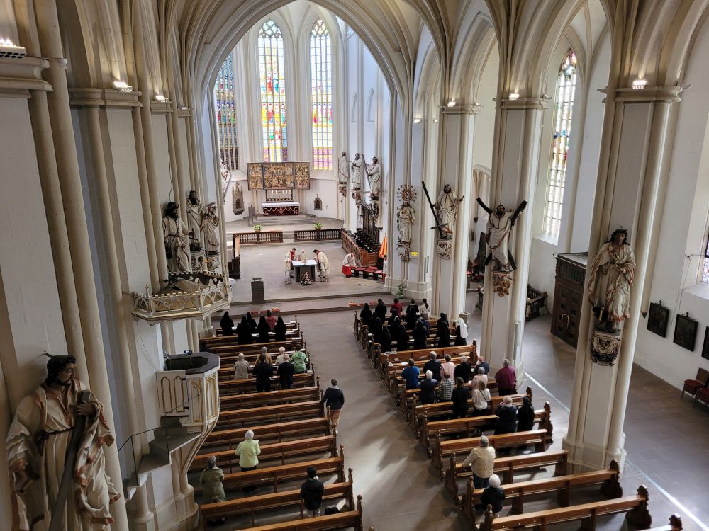 Am Samstag, 15. Sept. 2024, startete in aller Frühe ein Bus voller Schwestern nach Duderstadt, der Heimat unseres Hausgeistlichen Pfr. Albert Werner, wo er geboren und vor 50 Jahren zum Priester geweiht wurde. In St. Cyriakus, dem "Eichsfelder Dom", zelebrierte er zusammen mit Propst Berkefeld, der auch die Predigt übernahm, und Pfr. Hellauer, der zur Zeit im Mutterhaus weilt, die hl. Messe, vom Schwesternchor festlich gestaltet. Etliche Verwandte und Bekannte waren zu diesem festlichen Anlass gekommen. Anschließend ging es durch das malerische Städtchen mit seinen Fachwerkbauten und einem der ältesten Rathäuser Deutschlands zum Ursulinenkloster, wo wir freundlich bewirtet wurden. Die Nachmittagsandacht im Stadtteil Tiftlingerode in der St. Nikolauskirche wurde vom dortigen Kirchenchor umrahmt.