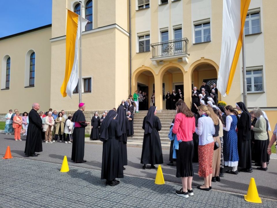 Es war eine besondere Freude, dass Erzbischof Gänswein, der langjährige Sekretär von Papst Benedikt XVI., am 1. Mai, dem Fest Patrona Bavariae, in der Mutterhauskirche ein Pontifikalamt feierte. Nach altem Brauch wurde der hohe Gast vor der Klosterpforte mit einem gemeinsam gesungenen Kanon und einem Gedicht begrüßt. In seiner Festpredigt sagte der Erzbischof u. a., dass er von Papst Benedikt des Öfteren von den Auerbacher Schulschwestern gehört habe und er deshalb den Wunsch hatte, dieses "blühende Kloster" aus eigenem Erleben kennenzulernen. Nach dem musikalisch vom Schwesternchor mit Organist Georg Schäffner edel gestalteten Festgottesdienst wurden beim Mittagessen nicht nur köstliche Speisen, sondern auch einige Anekdoten von Erzbischof Gänswein serviert.