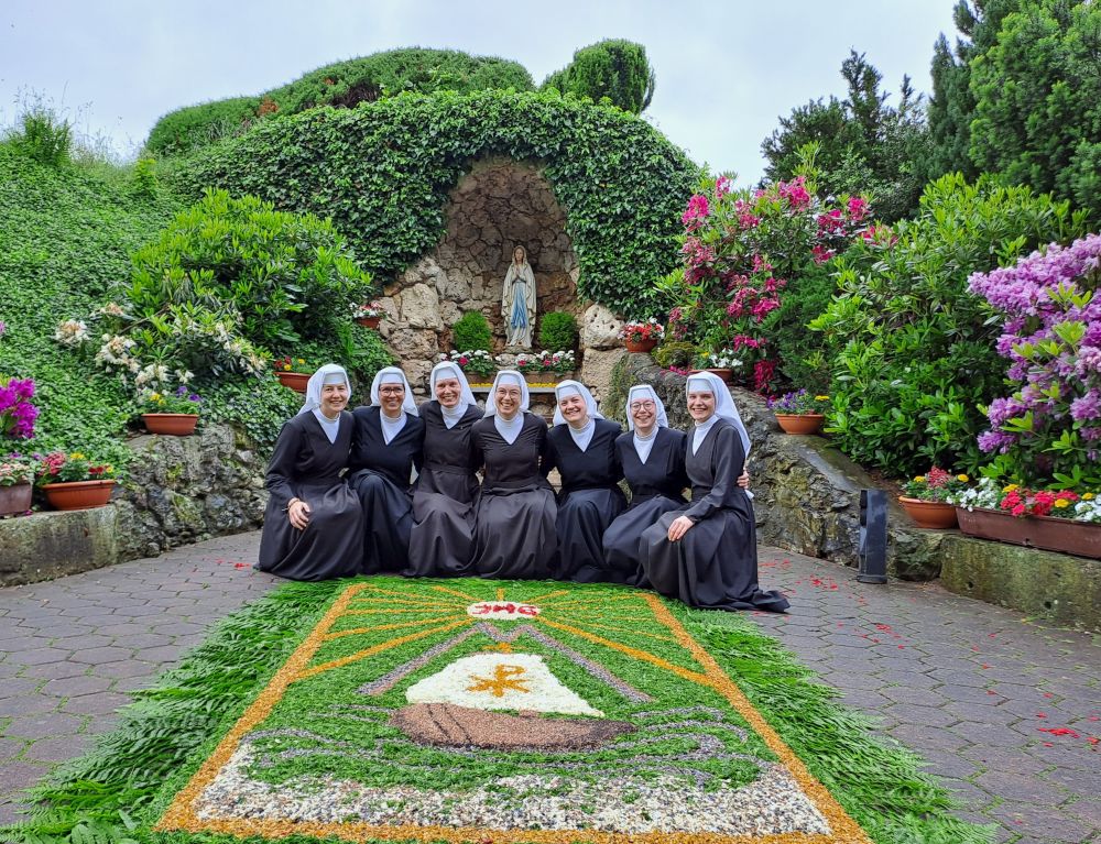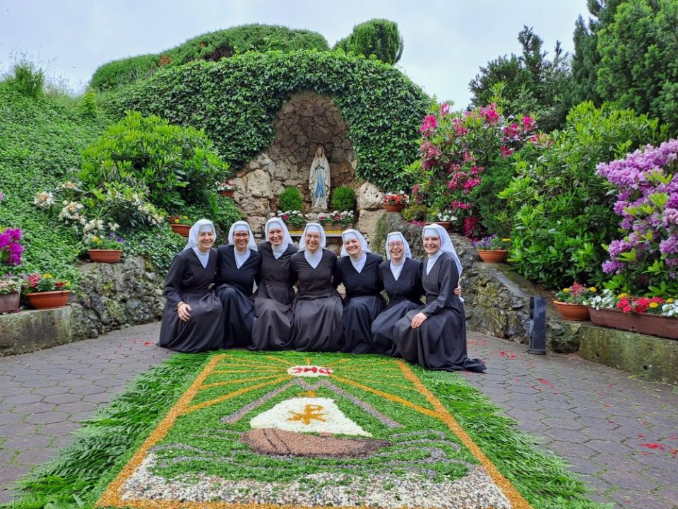 Schon wochenlang hatten sich die Novizinnen Gedanken gemacht über das Motiv des diesjährigen Blumenteppichs für Fronleichnam (30. Mai 2024) und über die Beschaffung der dazu nötigen Blumen. Emsig machten sie sich an die Arbeit, unterstützt von den Schwestern im Ruheheim, welche die Kleinarbeit (Blütenzupfen) erledigten. Wegen des Regenwetters am Festtag hielt die Pfarrei Auerbach die Prozession in der Kirche ab. So legten die Novizinnen den Teppich vor die Grotte im Klosterpark - zur Freude der Muttergottes und weiterer Besucher.