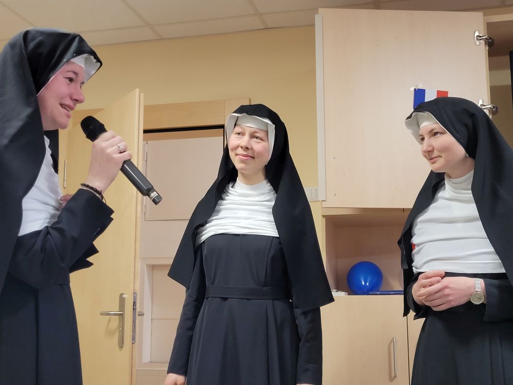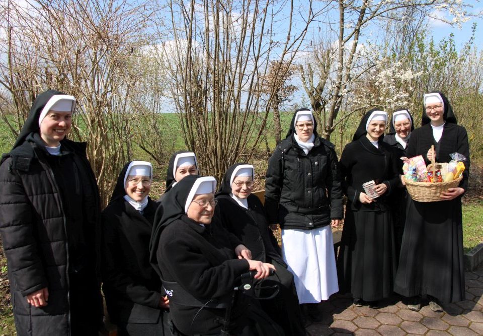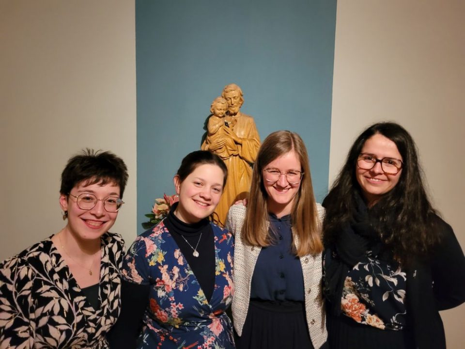 Am Samstag, 18. Febr. 2023, wurden vier Kandidatinnen - Natalie, Anne, Mirjam, Margareta (von links nach rechts) - in das Postulat aufgenommen und bereiten sich nun ein halbes Jahr lang auf die Einkleidung am Samstag, 26. Aug. 2023, vor unter Anleitung von S. M. Klarissa. Traditionell ging der Zeremonie die Andacht über unser Ordenszeichen voraus, die vom Chor gestaltet wurde. Die besinnlichen Texte stimmten wunderbar ein auf den wichtigen Schritt in das Ordensleben.