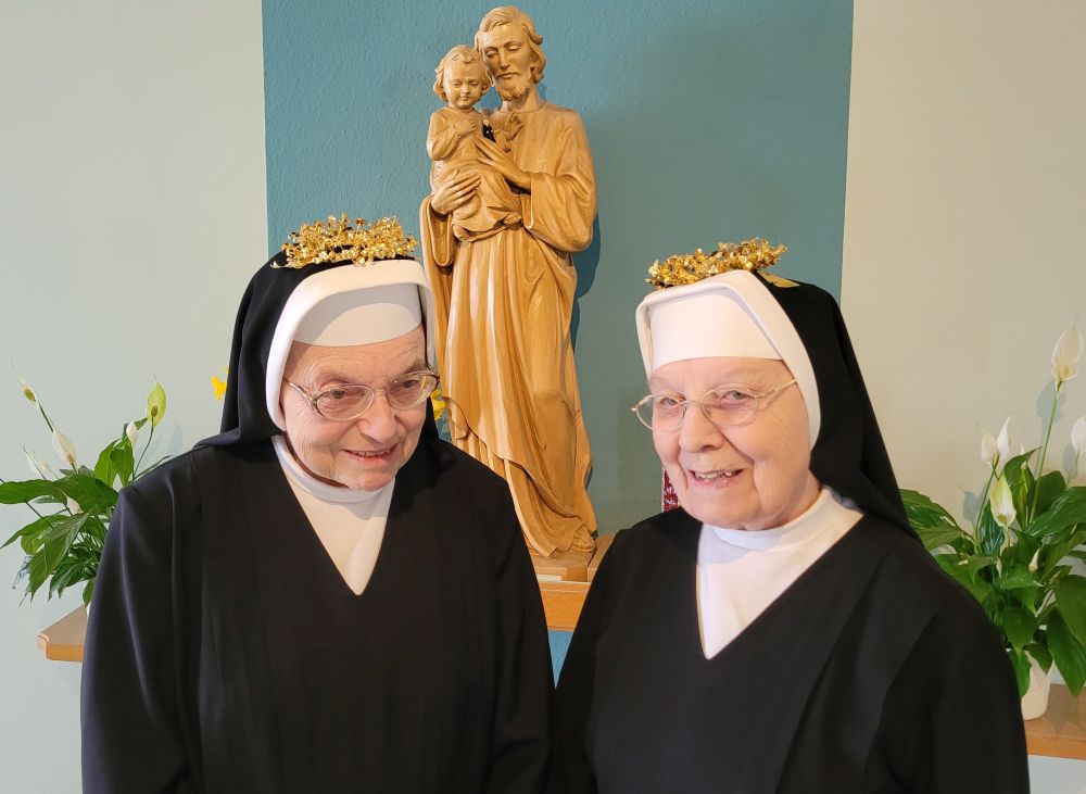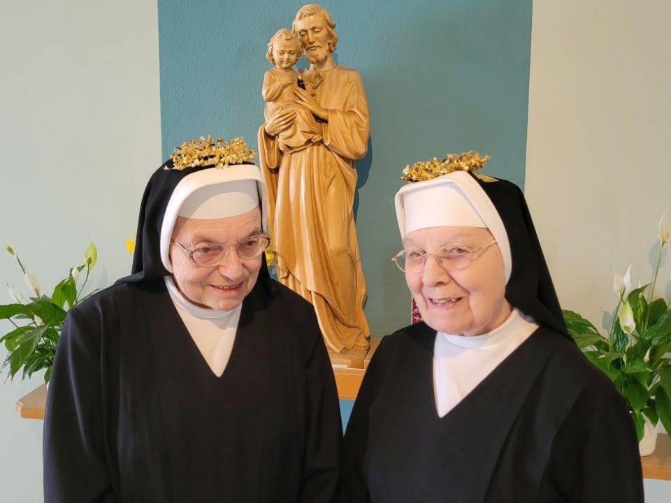 Zum Abschluss der Osterexerzitien (10.-16. April 2023) beging S. M. Perpetua (rechts) ihr 60-jähriges und S. M. Jutta (links) ihr 50-jähriges Professjubiläum. Erstere war zeitlebens als Erzieherin in verschiedenen Filialen tätig, Letztere war eine Krankenpflegerin mit Leib und Seele in der St. Johannes Klinik in Auerbach. Beim festlichen Gottesdienst in der Mutterhauskirche erneuerten die beiden ihre Gelübde und empfingen als Erste in der hl. Kommunion ihren "göttlichen Bräutigam". Nach dem feierlichen Einzug in den Saal wurden die Jubilarinnen mit Gesängen und Gedichten geehrt.