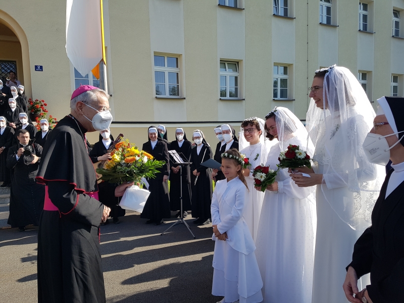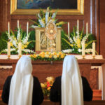 Mit der Einkleidung, bei der man neben dem Ordenskleid auch das Brevier, die Ordensregel und einen neuen Namen – Schwester Maria … von Unserer Lieben Frau – erhält, beginnt das zweijährige Noviziat, die intensive Einführung in das Leben als Schulschwester. Ehrliches Bemühen, die Bereitschaft, die Liebe im Klosteralltag zu üben, und eine wachsende innere Vertrautheit mit dem göttlichen Bräutigam sind für das Gelingen unerlässlich. Das große Foto oben zeigt Veronika, Elena und Maxi als Bräute (2019). Die Fotogalerie gibt einen Eindruck vom Fest der Einkleidung von Katharina, Anke und Natalia (2021).